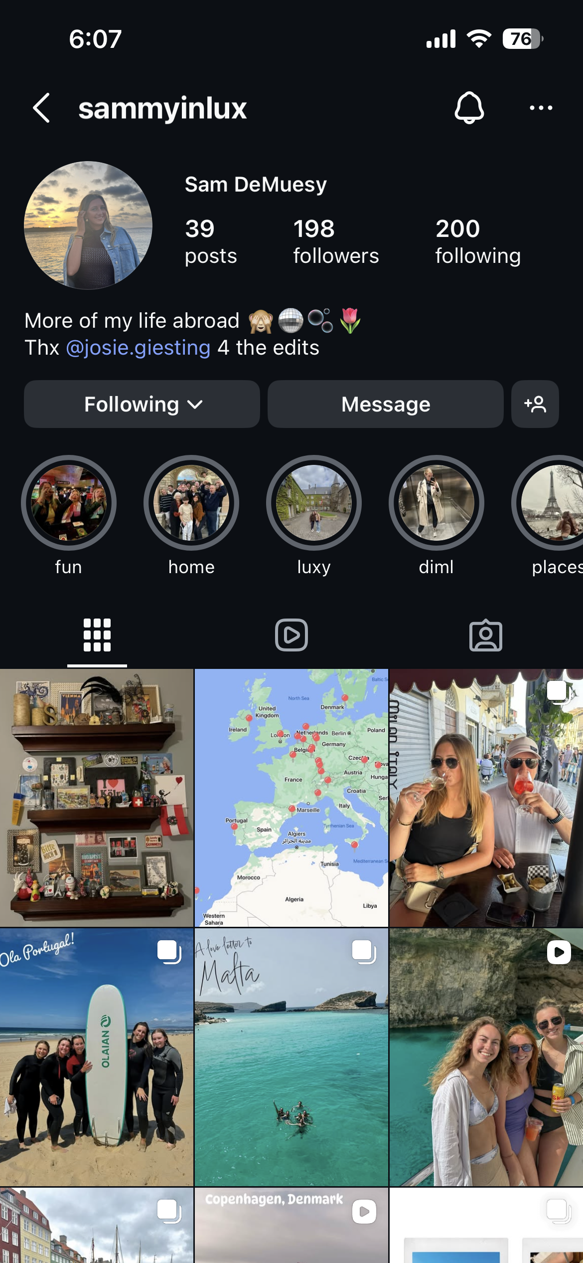 Collaborated closely with a friend studying abroad to create curated social media content that told the story of her travels. She shared photos, locations, and personal stories with me in real time, and I transformed them into cohesive, engaging posts that reflected her experiences and personality. This process became both a creative partnership and a meaningful way for us to stay connected while she was away.
